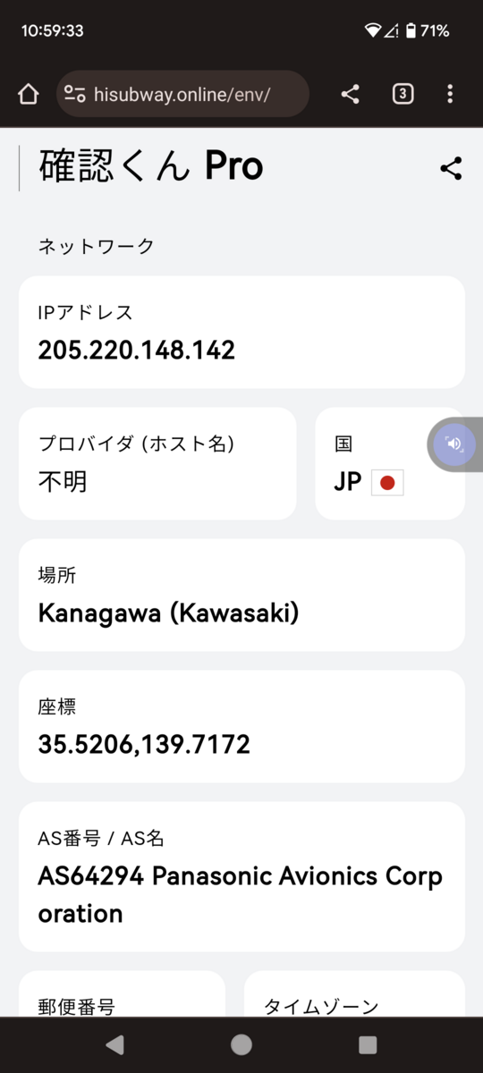 「Panasonic Avionics Corporation」は、205.220.128[.]0~205.220.159[.]255の範囲 = 8192個のグローバルIPを所持してるみたいです。